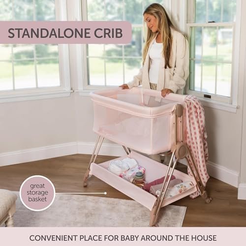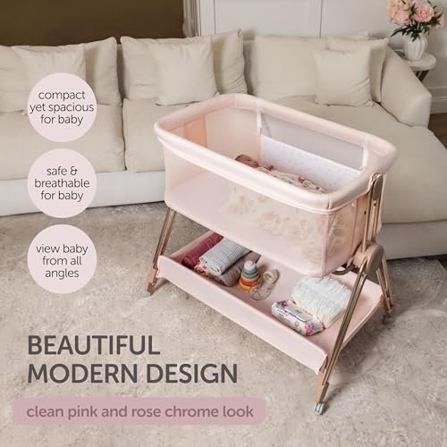 The soft pink accents give the Baby Bedside Sleeper – Bassinet & Bedside Crib with Height Adjustment & Wheels – Can Be Placed Next to Bed – Attaches to Parents Bed – Easy to Fold & Carry Bassinet for Girls (Pink) a warm, elegant aesthetic. It blends beautifully with modern interiors and adds a gentle, feminine touch to your baby’s room.