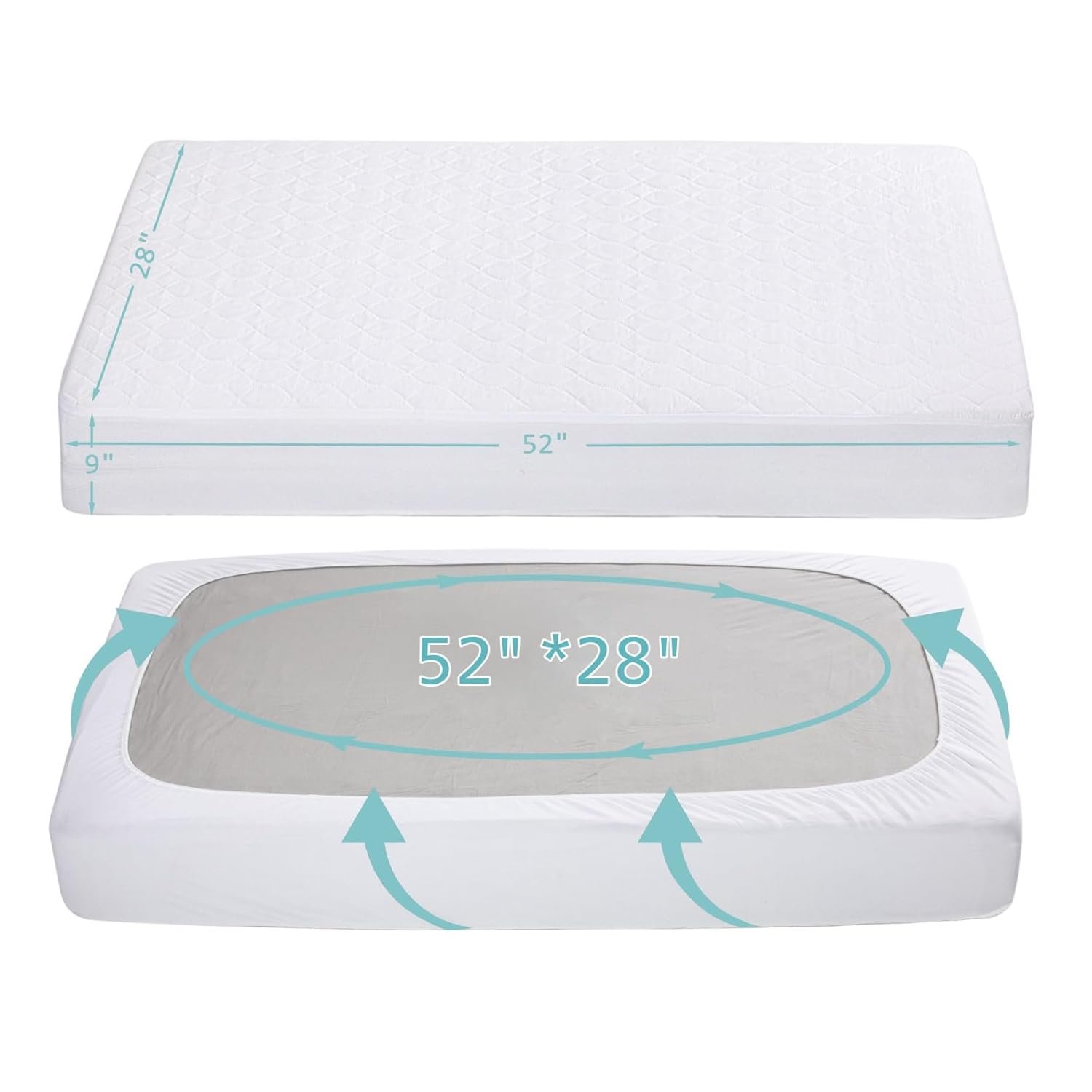 - Deep Secure Fit: Designed at 52″ x 28″ x 9″ to envelop full-size crib and toddler mattresses up to 6″ thick. The all-around elastic crib sheet-style pocket gives a secure fit mattress experience, eliminating slipping and bunching.