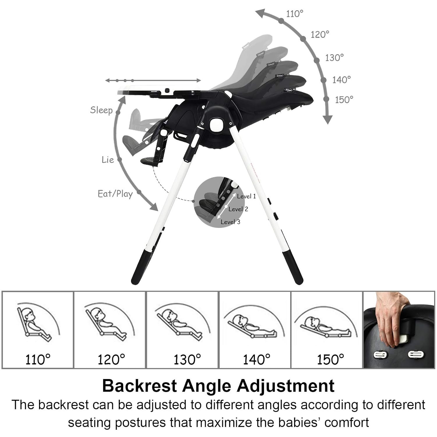 - 6-in-1 Adjustability: With 7 height settings, 5 reclining high chair positions, 3 footrest options, and 3 tray depths, this adjustable high chair adapts perfectly from infant to independent toddler. The backrest and footrest can be tailored as your child grows, ensuring ergonomic support at every stage.