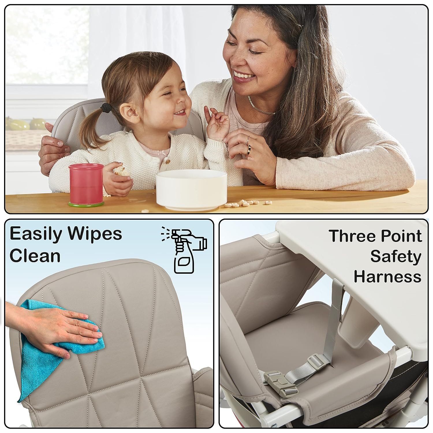 - Easy Clean Baby Chair: The cushioned leatherette seat pops out for a quick wipe and the removable tray is dishwasher safe, so you’ll spend less time scrubbing and more time engaging with your child.