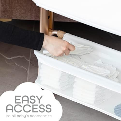 Functionality plays a major role in the design, particularly with the spacious under-bassinet storage basket. This compartment is ideal for keeping diapers, wipes, burp cloths, spare clothing, and feeding supplies neatly organized and accessible. Having these essentials within reach helps streamline nighttime routines by reducing movement and maintaining a peaceful environment for the baby.