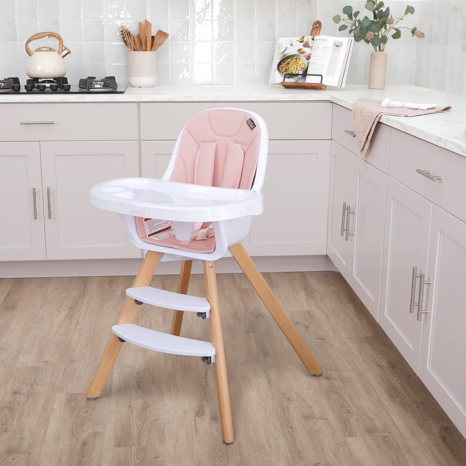 • Style-Conscious Caregivers: Love a modern look in the kitchen? The solid beechwood legs and soft pink, padded water-resistant highchair cushion blend seamlessly with trendy decor.